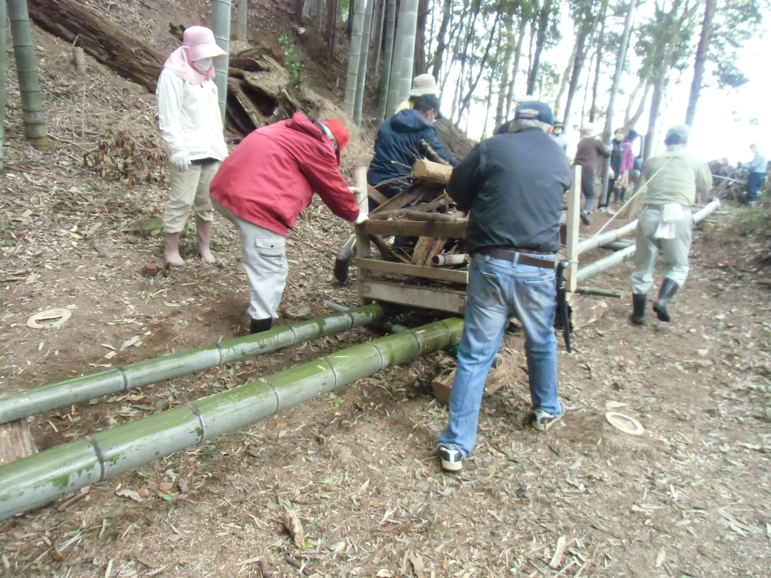 伐採し一定の寸法に刻んだ竹木を一時置き場と決めた場所の周辺から集める