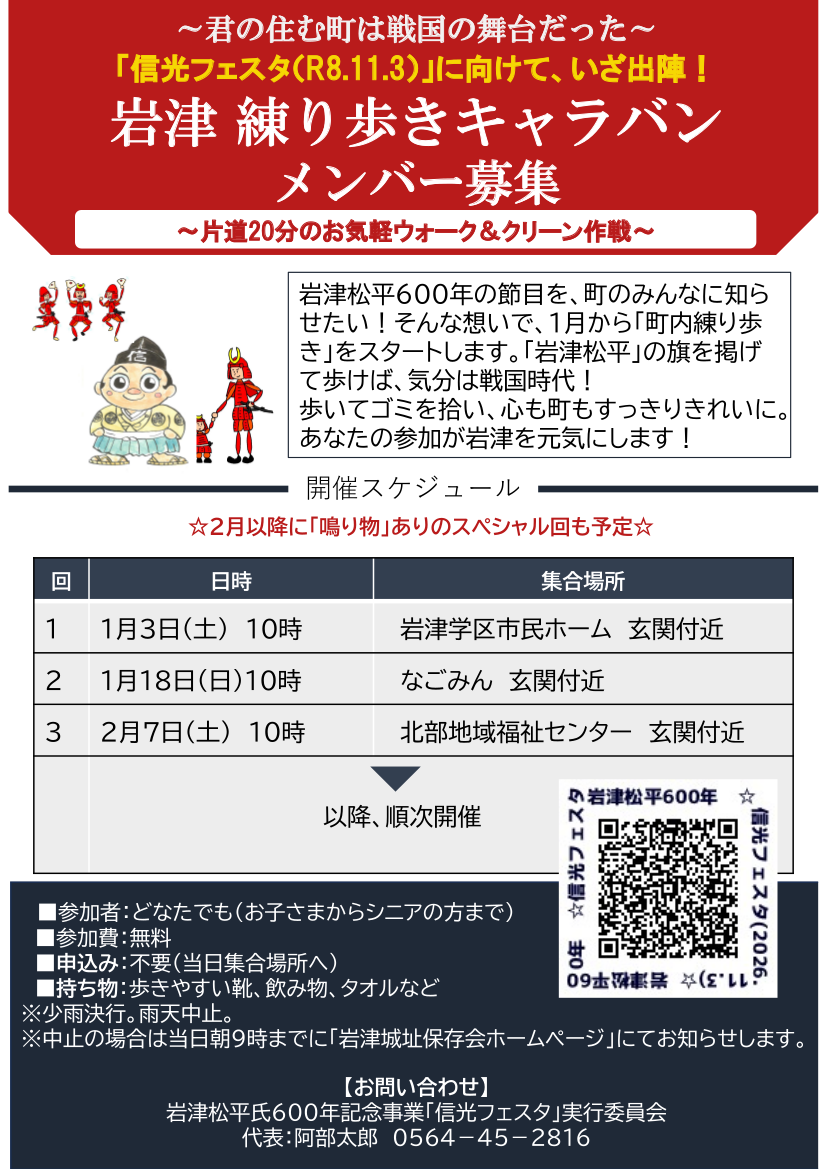 岩津「練り歩きキャラバン」メンバー募集! 岩津松平600年の節目を町のみんなに知らせたい! そんな想いで、1月から「町内練り歩き」をスタートします。 それに伴い、岩津「練り歩きキャラバン」参加メンバーを募集します。 詳細は下記チラシよりご覧ください。